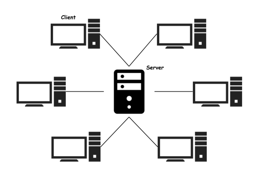 Čia vienas centrinis kompiuteris (server) veikia kaip pagrindinis mazgas, prie kurio jungiasi visi kiti (client).