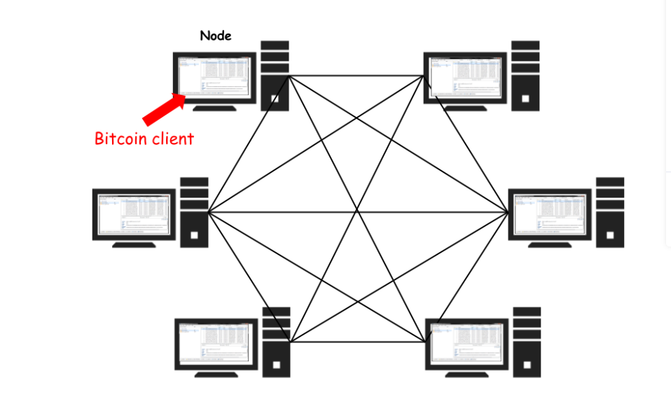 Šį tinklą sudaro tūkstančiai kompiuterių, kuriuose veikia Bitcoin programinė įranga. Čia nėra jokio centrinio serverio – visi kompiuteriai bendrauja tiesiogiai, todėl tinklas vadinamas decentralizuotu.